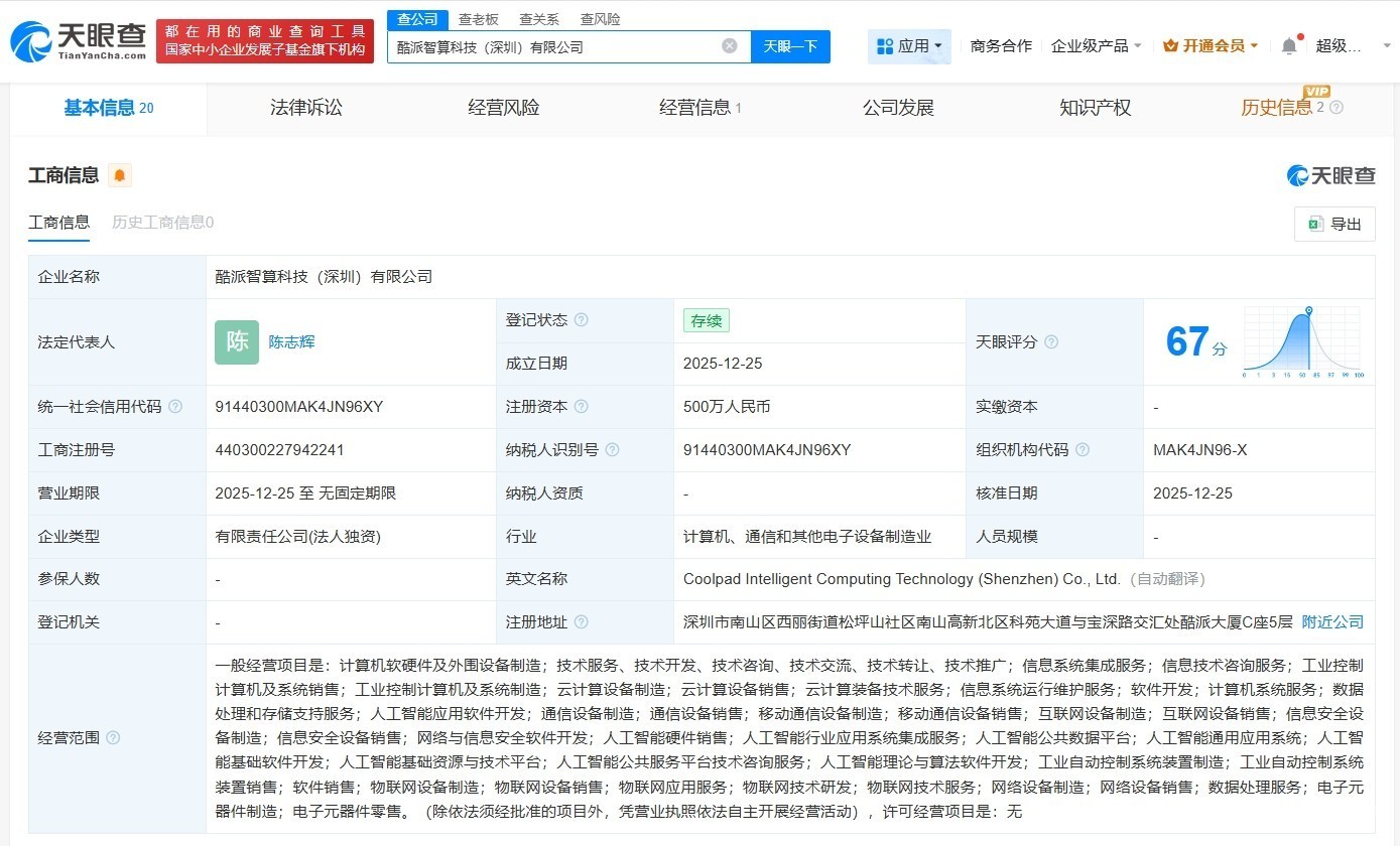 【CNMO科技消息】近日,老牌手机制造商酷派集团在深圳布局人工智能与算力领域的新动作引发市场关注。天眼查工商信息显示,酷派智算科技(深圳)有限公司于近日正式成立。